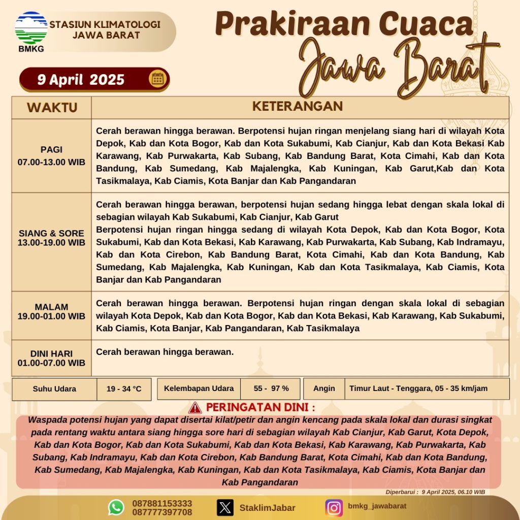 Disampaikan dengan hormat Prakiraan Cuaca Wilayah Jawa Barat Tanggal 9 April 2025 sebagai berikut: