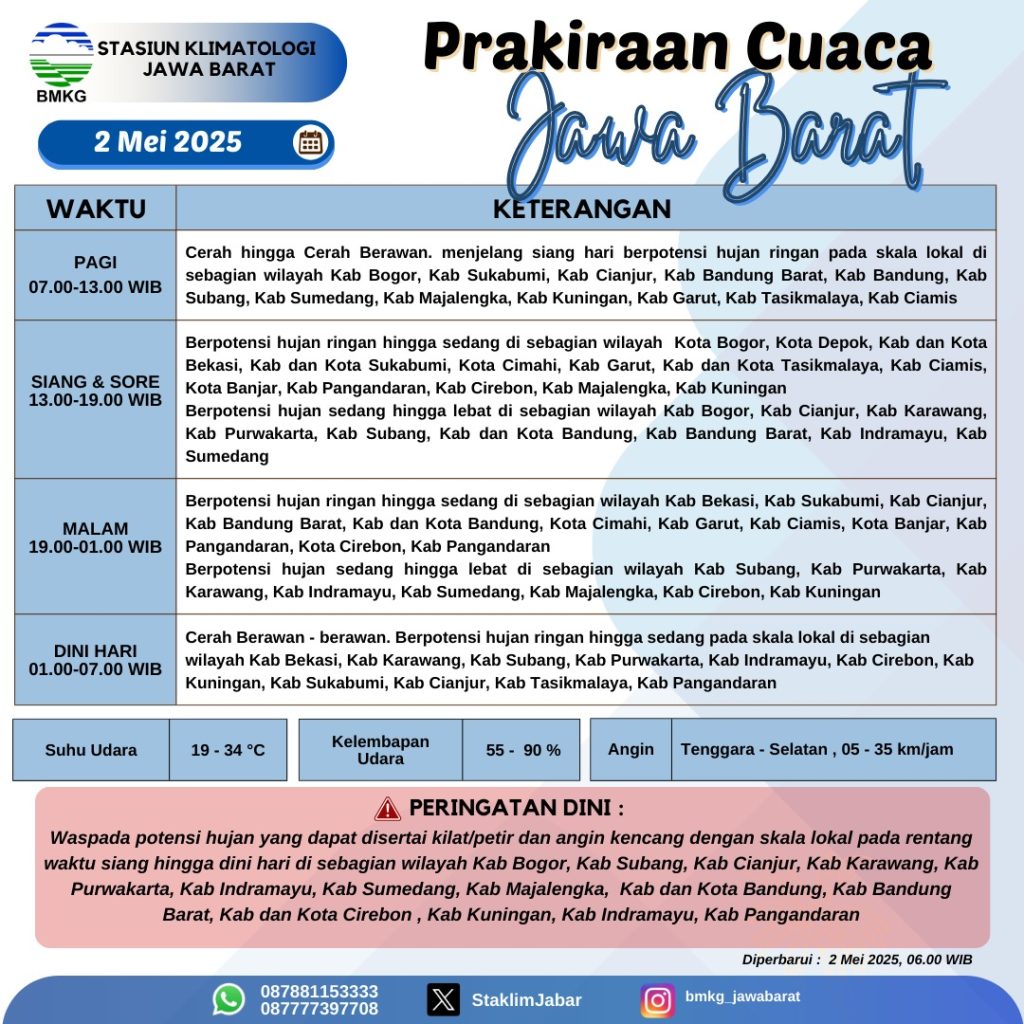 Disampaikan dengan hormat Prakiraan Cuaca Wilayah Jawa Barat Tanggal 2 Mei 2025 sebagai berikut:
